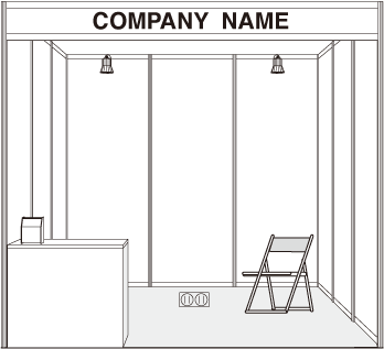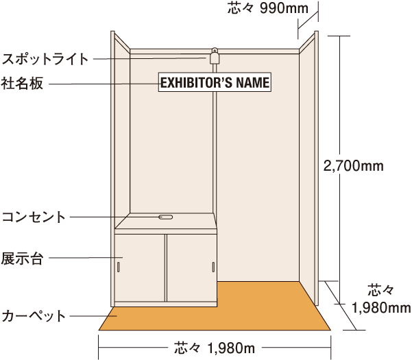 間口1,980mm×奥行1,980mmの展示スペース、間仕切り(後壁、側壁990mm)、社名板、カーペット、